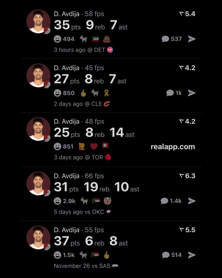 据统计,阿夫迪亚已经连续5场砍下至少25分5板5助,追平利拉德,并列队史最长纪录。