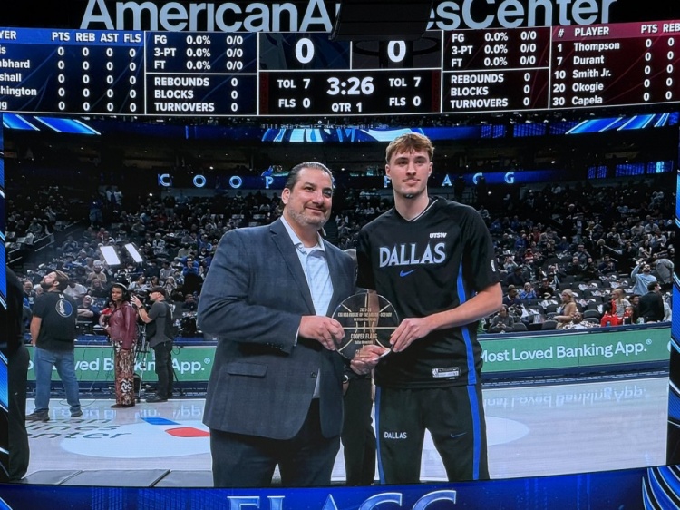 12月7日讯 独行侠主场迎战火箭,状元弗拉格赛前领取月最佳新秀奖。