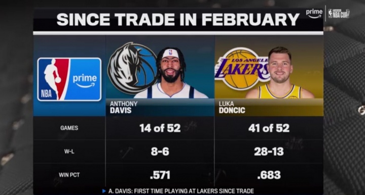 在大交易之后,浓眉52场比赛只打了14场——8胜6负;东契奇则是52场出战41场,战绩是28胜13负!