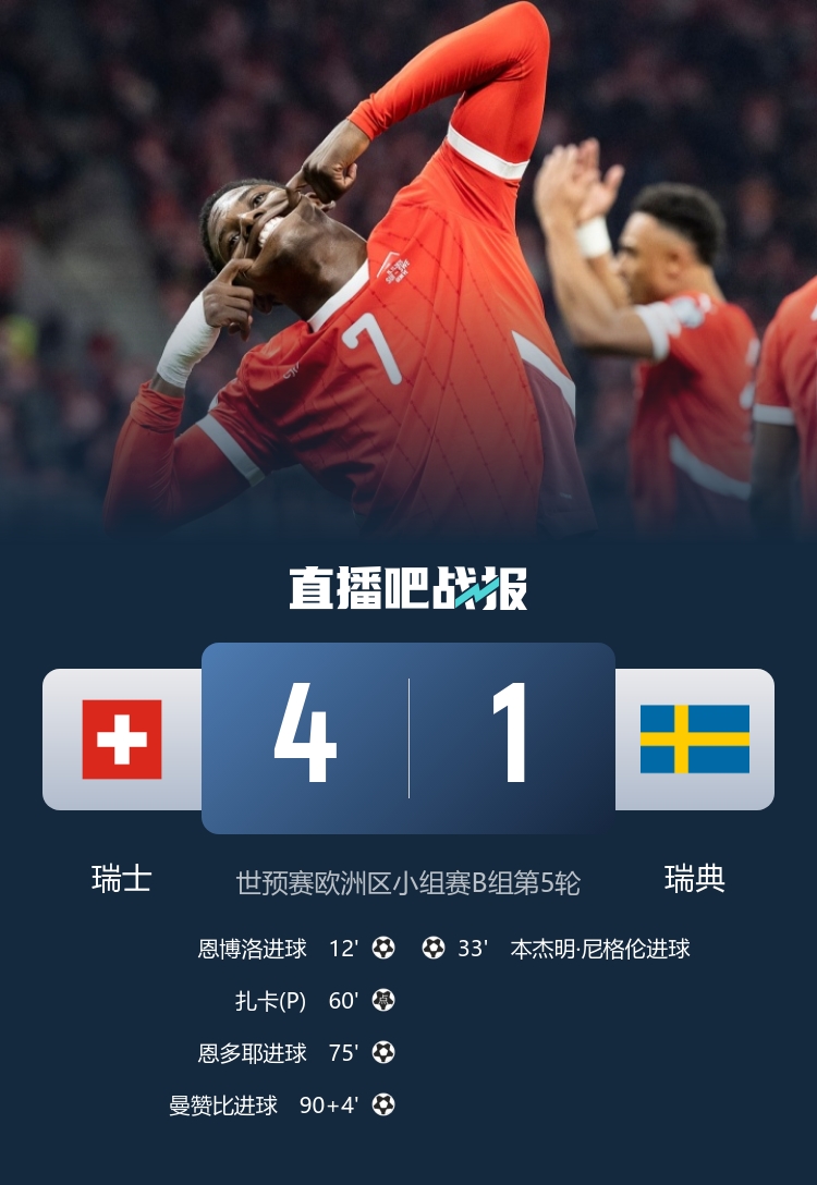 瑞士主场4-1战胜瑞典,瑞士积13分位居榜首,领先第2名科索沃3分+11粒净胜球,瑞典5轮不胜继续垫底。