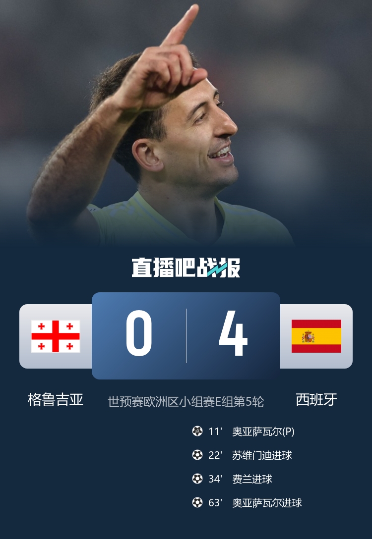 奥亚萨瓦尔双响,苏维门迪、费兰建功,西班牙4-0格鲁吉亚。