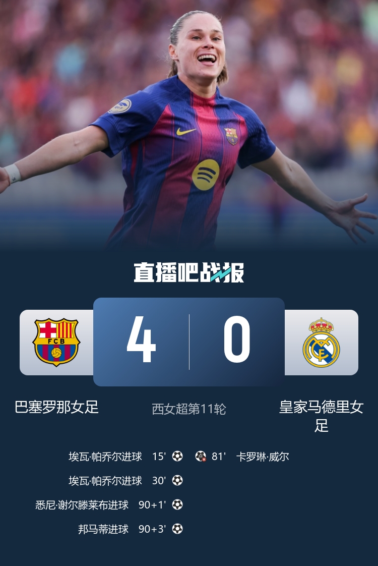 帕乔尔双响,谢尔滕莱和邦马蒂破门,巴塞罗那女足4-0皇家马德里女足!