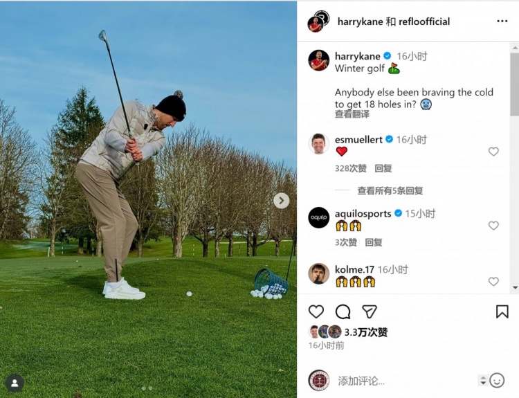 凯恩社媒晒出打高尔夫的照片,配文:“冬季高尔夫,还有谁顶着寒风打完18洞?”